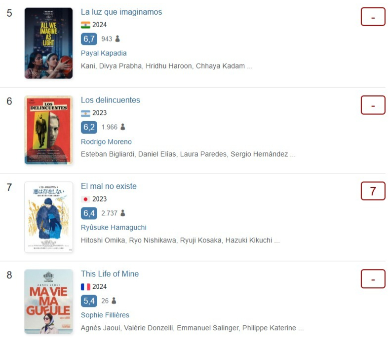 03:30 50. EL ÚLTIMO LATE NIGHT de Cameron Cairnes y Colin Cairnes (Late Night with the Devil, 2023) 04:10 49. LOS DESTELLOS de Pilar Palomero (2024) 04:54 48. BLITZ de Steve McQueen (2024) 5,7 AppleTV 05:35 47. MONKEY MAN de Dev Patel (2024) 6,1 06:23 46. STOPMOTION de Robert Morgan (2023) 07:13 45. HORIZON: AN AMERICAN SAGA - CAPÍTULO 1 de Kevin Costner (Horizon: An American Saga - Chapter 1, 2024) 08:04 44. ROBOT SALVAJE de Chris Sanders (The Wild Robot, 2024) 7,6 08:53 43. BIKERIDERS. LA LEY DEL ASFALTO de Jeff Nichols (The Bikeriders, 2023) 6,3 116 min 09:50 42. EL CLAN DE HIERRO de Sean Durkin (The Iron Claw, 2023) 10:45 41. CLOUD de Kiyoshi Kurosawa (Kuraudo, 2024) 11:50 40. ALIEN: ROMULUS de Fede Alvarez (2024) 12:47 39. VOLVERÉIS de Jonás Trueba (2024) 13:34 38. FURIOSA: DE LA SAGA MAD MAX de George Miller (Furiosa: A Mad Max Saga, 2024) 14:33 37. EL BRILLO DE LA TELEVISIÓN de Jane Schoenbrun (I Saw the TV Glow, 2024) 15:29 36. LOS INDESEABLES de Ladj Ly (Bâtiment 5, 2023) Filmin 101 minuts 16:24 35. KILL de Nikhil Nagesh Bhat (2023) 17:19 34. TRANSFORMERS ONE de Josh Cooley (2024) 18:17 33. EL CONDE DE MONTECRISTO de Alexandre de La Patèlliere y Matthieu Delaporte (Le comte de Monte-Cristo, 2024) 19:14 32. HASTA EL FIN DEL MUNDO de Viggo Mortensen (The Dead Don’t Hurt, 2023) 20:10 31. MADE IN ENGLAND: THE FILMS OF POWELL AND PRESSBURGER de David Hinton (2024) 7,6 Filmin 131 min 21:21 30. SATURDAY NIGHT de Jason Reitman (2024) 22:20 29. PERFECT DAYS de Wim Wenders (2023) 23:26 28. DE NATURALEZA VIOLENTA de Chris Nash (In a Violent Nature, 2024) 24:37 27. THE SWEET EAST de Sean Price Williams (2023) 6,2 Filmin 104 min 25:34 26. LA ESTRELLA AZUL de Javier Macipe (2024) 26:42 25. JOKER: FOLIE À DEUX de Todd Phillips (2024) 27:59 24. SANGRE EN LOS LABIOS de Rose Glass (Love Lies Bleeding, 2024) 29:05 23. NOSFERATU de Robert Eggers (2024) 30:12 22. DUNE: PARTE DOS de Denis Villeneuve (Dune: Part Two, 2024) 31:28 21. CIVIL WAR de Alex Garland (2024) 32:35 20. EL CIELO ROJO de Christian Petzold (Roter Himmel, 2023) 34:01 19. LA PRIMERA PROFECÍA de Arkasha Stevenson (The First Omen, 2024) 35:13 18. EL MAL NO EXISTE de Ryusuke Hamaguchi (Aku wa sonzai shinai, 2023) 36:16 17. JURADO Nº2 de Clint Eastwood (Juror #2, 2024) 37:32 16. CÓNCLAVE de Edward Berger (Conclave, 2024) 38:29 15. EMILIA PÉREZ de Jacques Audiard (2024) 39:29 14. LA ZONA DE INTERÉS de Jonathan Glazer (The Zone of Interest, 2023) 40:47 13. LONGLEGS de Osgood Perkins (2024) 42:06 12. DREAM SCENARIO de Kristoffer Borgli (2023) 43:13 11. CUANDO ACECHA LA MALDAD de Demián Rugna (2023) 44:21 10. LA BESTIA de Bertrand Bonello (La bête, 2023) 45:34 9. HERE de Robert Zemeckis (2024) 46:53 8. LOS QUE SE QUEDAN de Alexander Payne (The Holdovers, 2023) 48:07 7. BIRD de Andrea Arnold (2024) 49:50 6. SEGUNDO PREMIO de Isaki Lacuesta y Pol Rodríguez (2024) 51:29 5. RIVALES de Luca Guadagnino (Challengers, 2024) 6,3 Prime 131 min 52:59 4. POBRES CRIATURAS de Yorgos Lanthimos (Poor Things, 2023) 54:37 3. LA SUSTANCIA de Coralie Fargeat (The Substance, 2024) 56:17 2. LA QUIMERA de Alice Rohrwacher (La chimera, 2023) 6,9 Filmin 130 min 57:48 1. ANORA de Sean Baker (2024) Filmin